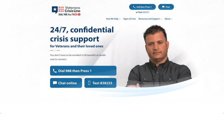 ...Asistencia en situaciones de crisis las 24 horas del día, los 7 días de la semana, para veteranos y sus familias, por teléfono, mensaje de texto o chat en línea.